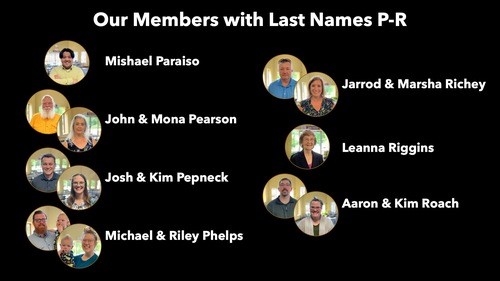 This week we are praying for our members with last names that start with P-R. Be praying this week for Mishael Paraiso, John and Mona Pearson, Josh and Kim Pepneck, Michael and Ryley Phelps, Jarrod and Marsha Richey, Leanna Riggins, and Aaron and Kim Roach.